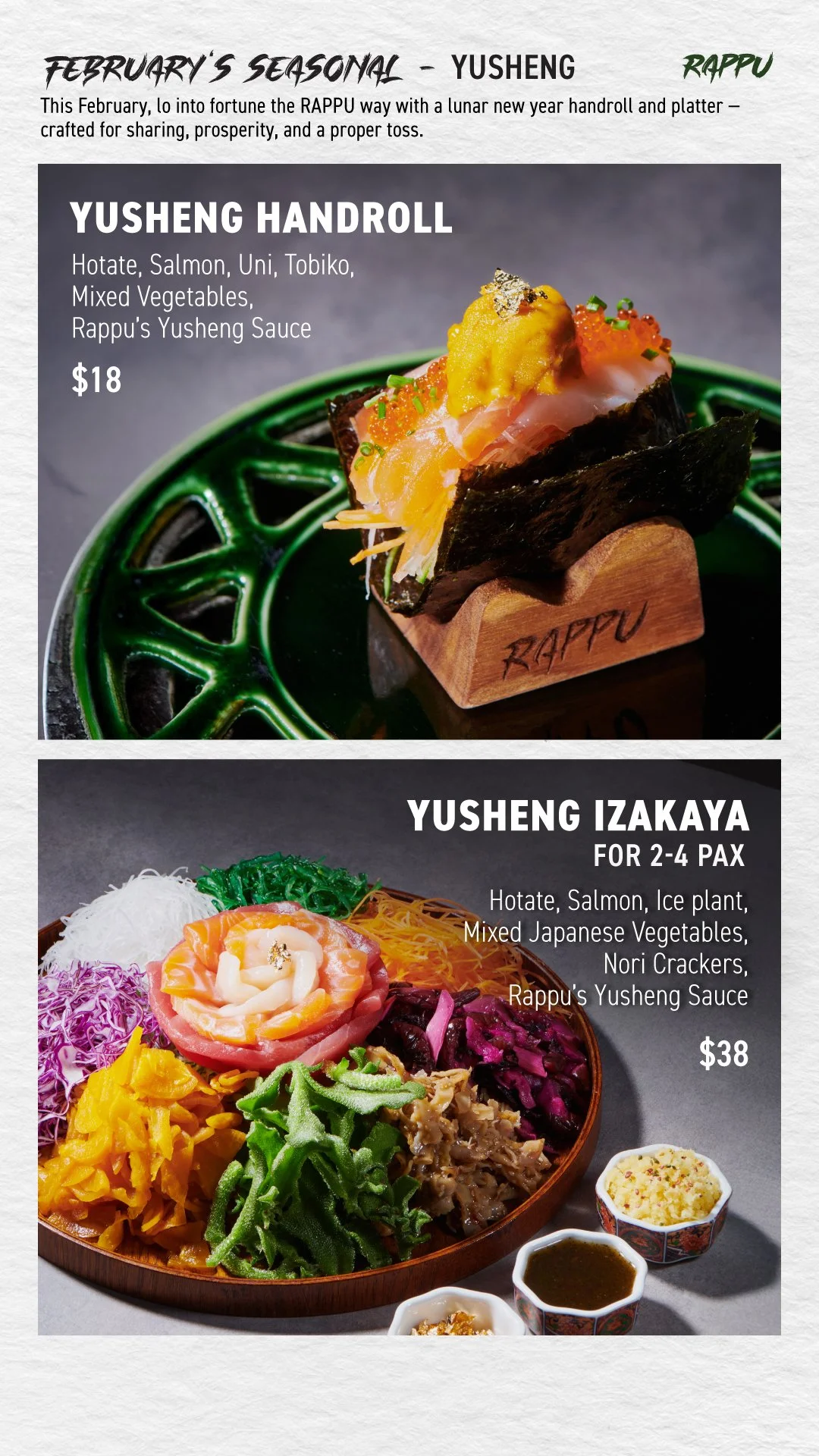 Our Yusheng Platter brings together premium sashimi, vibrant crunch, and all the colours of the season — fresh salmon, hotate, crisp vegetables, and Rappu’s house yuzu yusheng sauce, finished with edible flowers and gold flakes for a touch of prosperity.